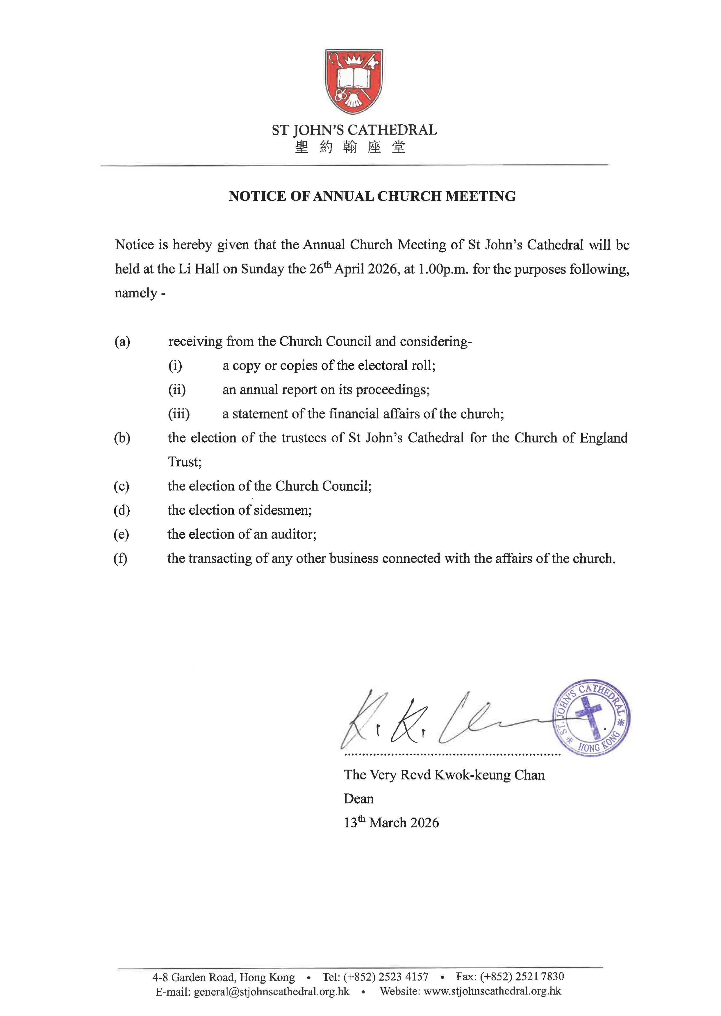 Notice is hereby given that the Annual Church Meeting of St John’s Cathedral will be held in the Li Hall on Sunday the 26th April 2026, at 1.00pm for the purposes following, namely -