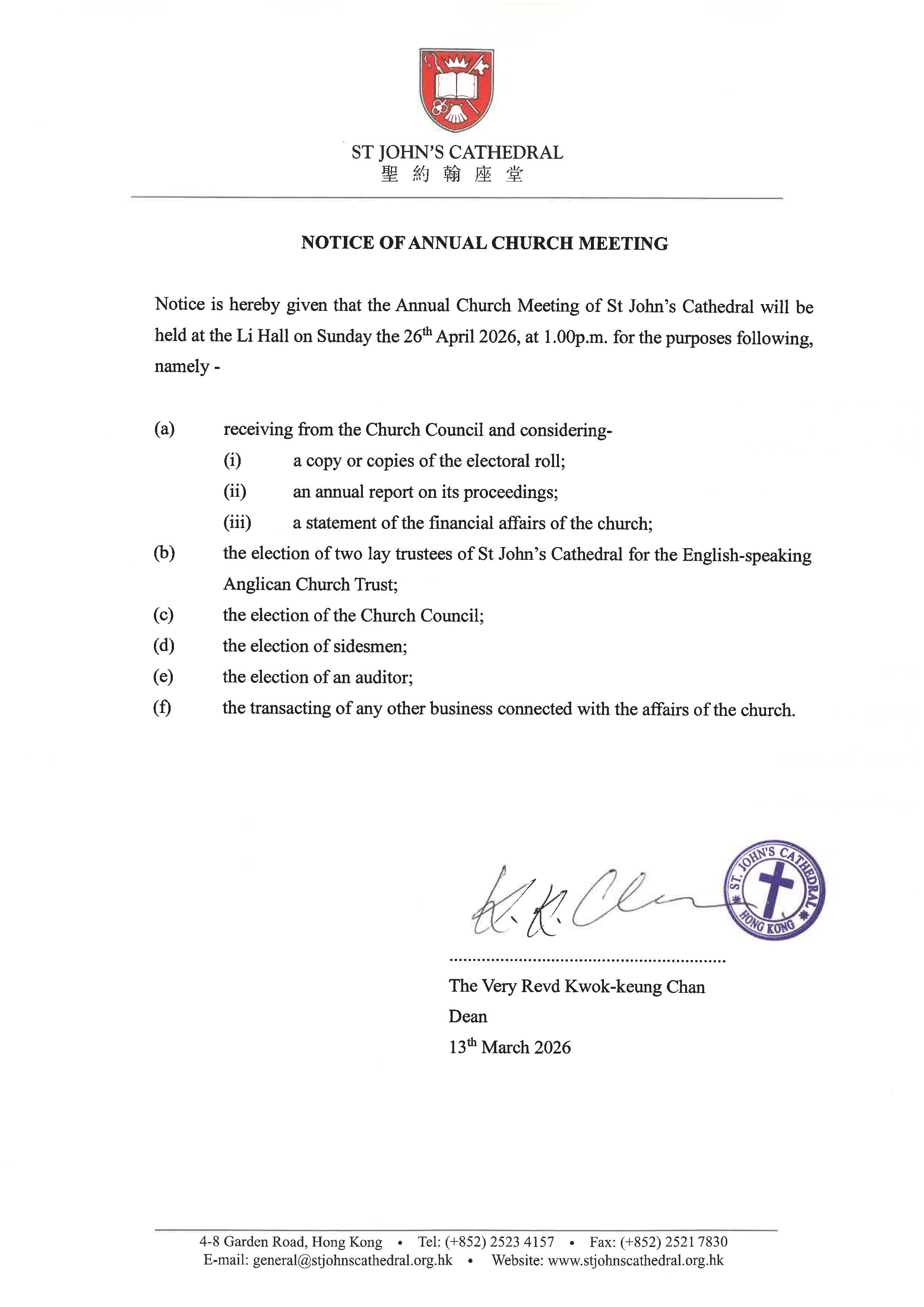 Notice is hereby given that the Annual Church Meeting of St John’s Cathedral will be held in the Li Hall on Sunday the 26th April 2026, at 1.00pm for the purposes following, namely -