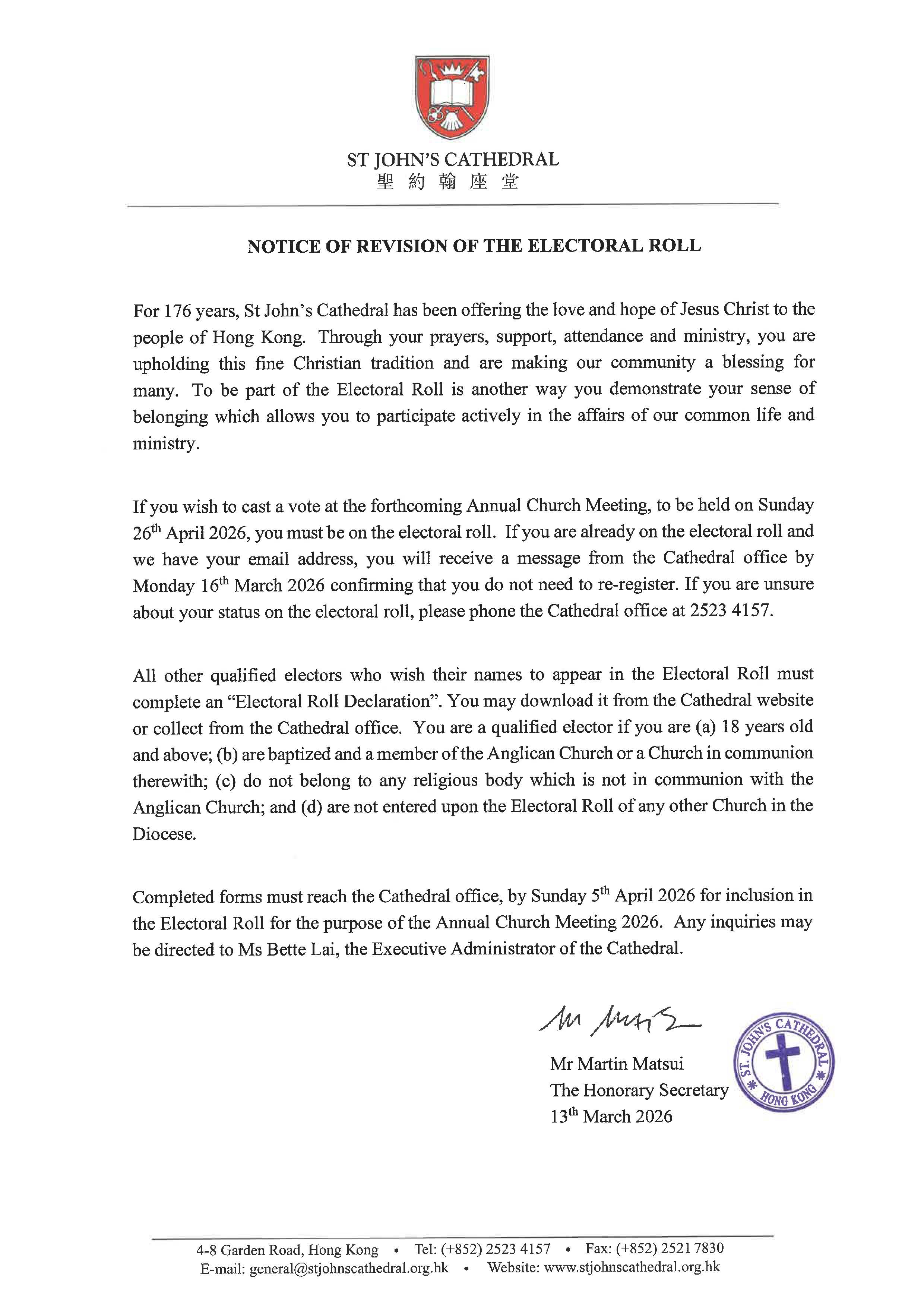 Notice is hereby given that the Annual Church Meeting of St John’s Cathedral will be held in the Li Hall on Sunday the 26th April 2026, at 1.00pm for the purposes following, namely -